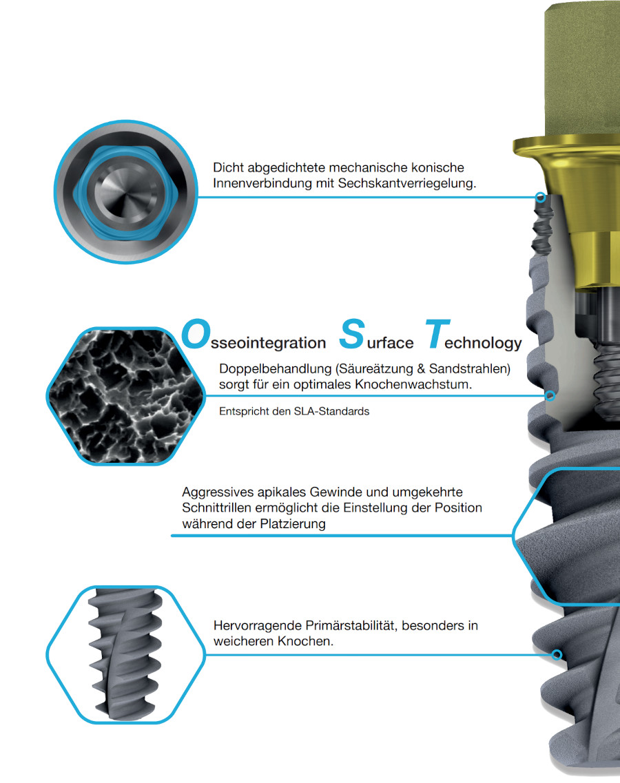 Osseointegrations-Oberflächentechnologie: Die doppelte Behandlung (Säureätzung und Sandstrahlen) gewährleistet ein optimales Knochenwachstum.