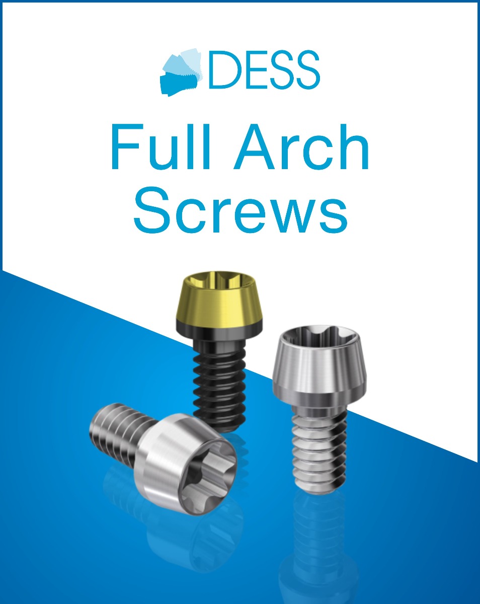DESS® bietet eine breite Sortiment von Optionen zur Verbesserung des Ergebnisses Ihrer Full Arch Restaurationen. Dazu gehört die neue Full Arch Screw für Multi-Unit, die eine dickere Sitzdicke der Struktur und die Möglichkeit bietet, den Schraubenkanal um bis zu 25° zu korrigieren. Diese innovative Lösung ist in die DESS® Bibliotheken integriert.