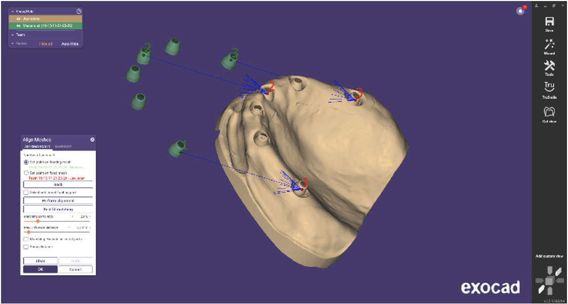 Die Kombination aus den mit dem Intraoralscanner aufgenommenen Abdrücken des Unterkiefers und des Weichgewebes und den mit dem Photogrammetriesystem gemessenen exakten 3D-Darstellungen der Implantatposition und -angulation ermöglicht es den Fachleuten, ein sehr genaues und präzises CAD-Design der endgültigen Prothesen mit garantiert passiven Sitz zu erstellen.