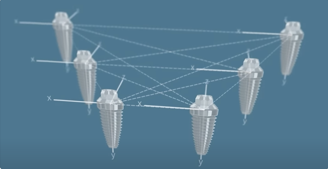 Im Zusammenhang mit der Implantologie wird die Photogrammetrie eingesetzt, um zusammenhängende Implantatpositionen und -winkel in drei Dimensionen genau zu erfassen. Durch die Anwendung mathematischer Beziehungen auf eine Reihe zweidimensionaler Bilder wird eine dreidimensionale Darstellung mehrerer Implantatpositionen erstellt.(2)