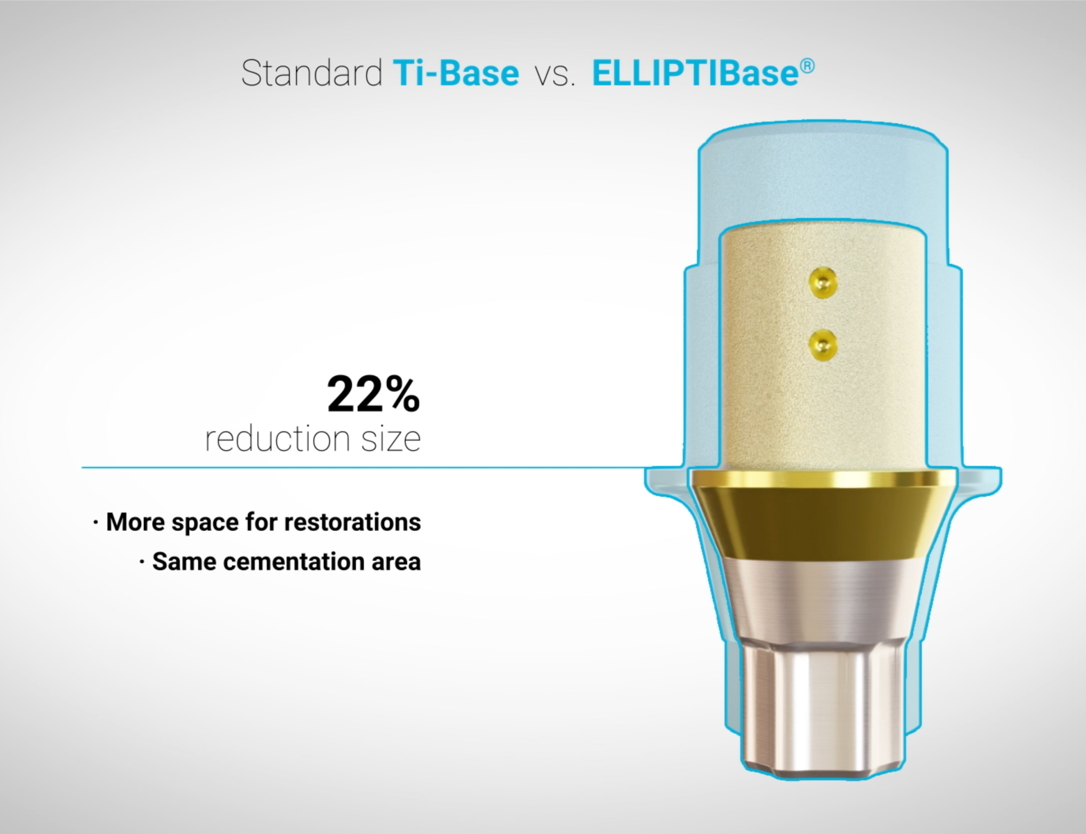 Its innovative elliptical and narrow design, with a 22% size reduction compared to a standard Ti-Base, makes it the best prosthetic solution for cases with limited interdental space, as it allows it to adapt to the geometry of the mouth and increase the space for the restorative material whilst maintaining almost the same cementation area.