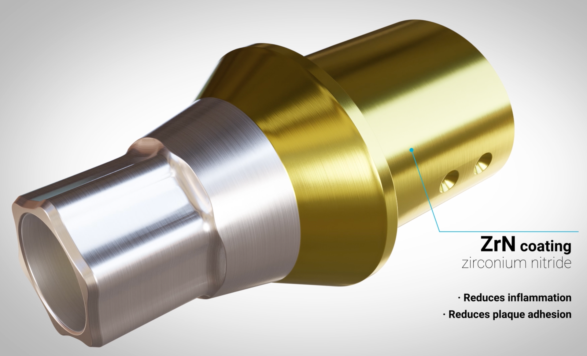 The ZrN coating is an enhancement surface treatment that improves the overall mechanical resistance and helps reduce inflammation and plaque adhesion, therefore the chances of periimplantitis are significantly lower. Furthermore, ZrN’s warm gold hue has aesthetic advantages compared to the titanium grey.