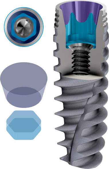 Internal conical connection with a dual function, at 12º creating the ultimate seal whilst reducing the possibility of micromovements, with hexagonal interlocking for a firmer connection with superior mechanical strength.