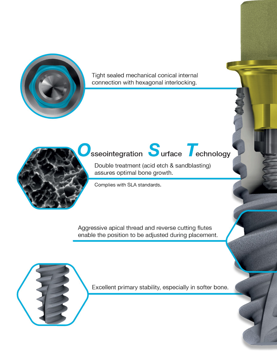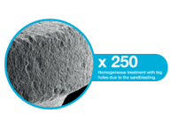 Osseointegration Surface Technology: Double treatment (acid etch & sandblasting) assures optimal bone growth.
