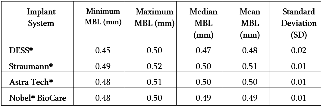 All groups showed significant bone loss (p < 0.05) from baseline to 3 months, but the differences between the groups were minimal, One-way ANOVA was conducted to compare the mean MBL between DESS®, Straumann®, Astra Tech®, or Nobel® Biocare.