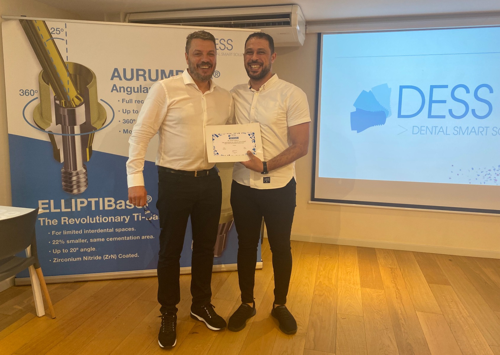 Por la tarde, recibieron una formación sobre DESS por parte de Oriol Tura y David Cuervo, nuestro equipo de Soporte Técnico. La formación consistió en dos presentaciones: Soluciones protésicas DESS, con una visión completa de la empresa y de los productos y soluciones DESS, y Flujo de trabajo digital DESS, dónde hablaron sobre cómo utilizar las soluciones digitales DESS en los diferentes sistemas CAD-CAM.
