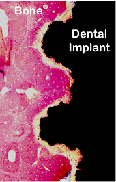 Coupe histologique microscopique d'un os encastré dans la surface en titane d'un implant dentaire (noir)